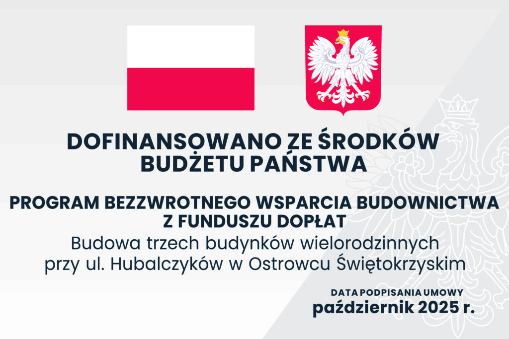 Miło nam Państwa poinformować, że nasza spółka już rozpoczęła realizację inwestycji mieszkaniowej przy ulicy Hubalczyków w Ostrowcu Świętokrzyskim. Inwestycja jest finansowana z udziałem bezzwrotnego wsparcia środkami Funduszu Dopłat z rządowego programu finansowego wsparcia budownictwa mieszkaniowego, których beneficjentem jest Gmina Ostrowiec Świętokrzyski.